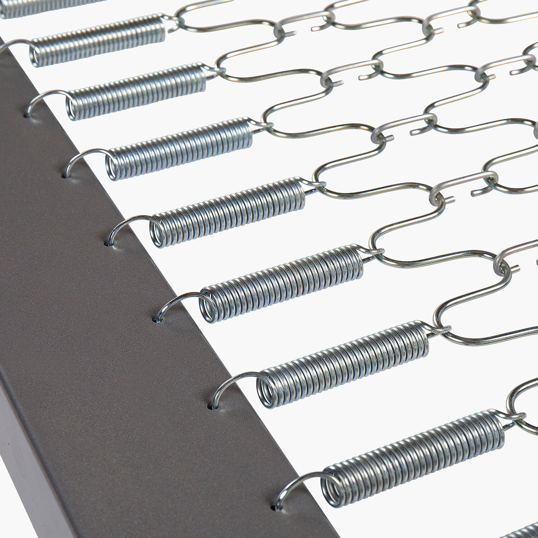 Rete ortopedica a maglia metallica, con due traverse di rinforzo e una speciale barra brevettata di supporto alla testa e ai piedi.